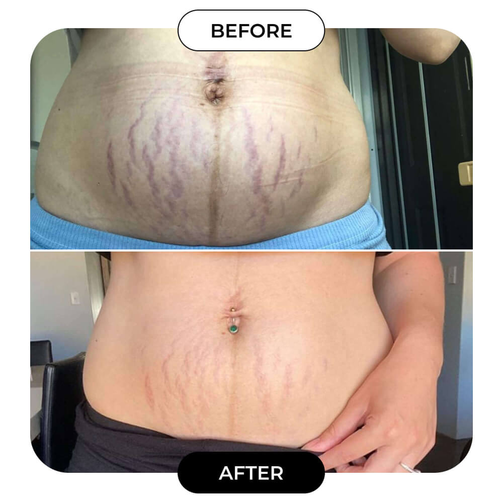 Stretch marks appear when the skin rapidly shrinks or stretches in times like pregnancy and weight gain or loss journeys. B-FLAT was formulated for women who want to fade the look of their stretch marks and visibly tighten loose skin on their bellies. It is perfect for postpartum moms or anyone on a weight loss journey.